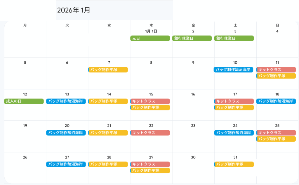 2026年は、バッグ制作クラスは1月7日(水)より、キットクラスは1月11日(日)よりレッスンを開始致します。受講頻度の増加・いつもの曜日(平日/週末)からの変更は、ご予約前に一旦ご相談ください。